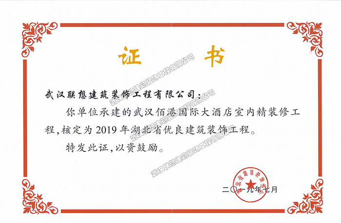 2019年湖北省優良建筑裝飾工程(武漢佰港國際大酒店室內精裝修工程)
