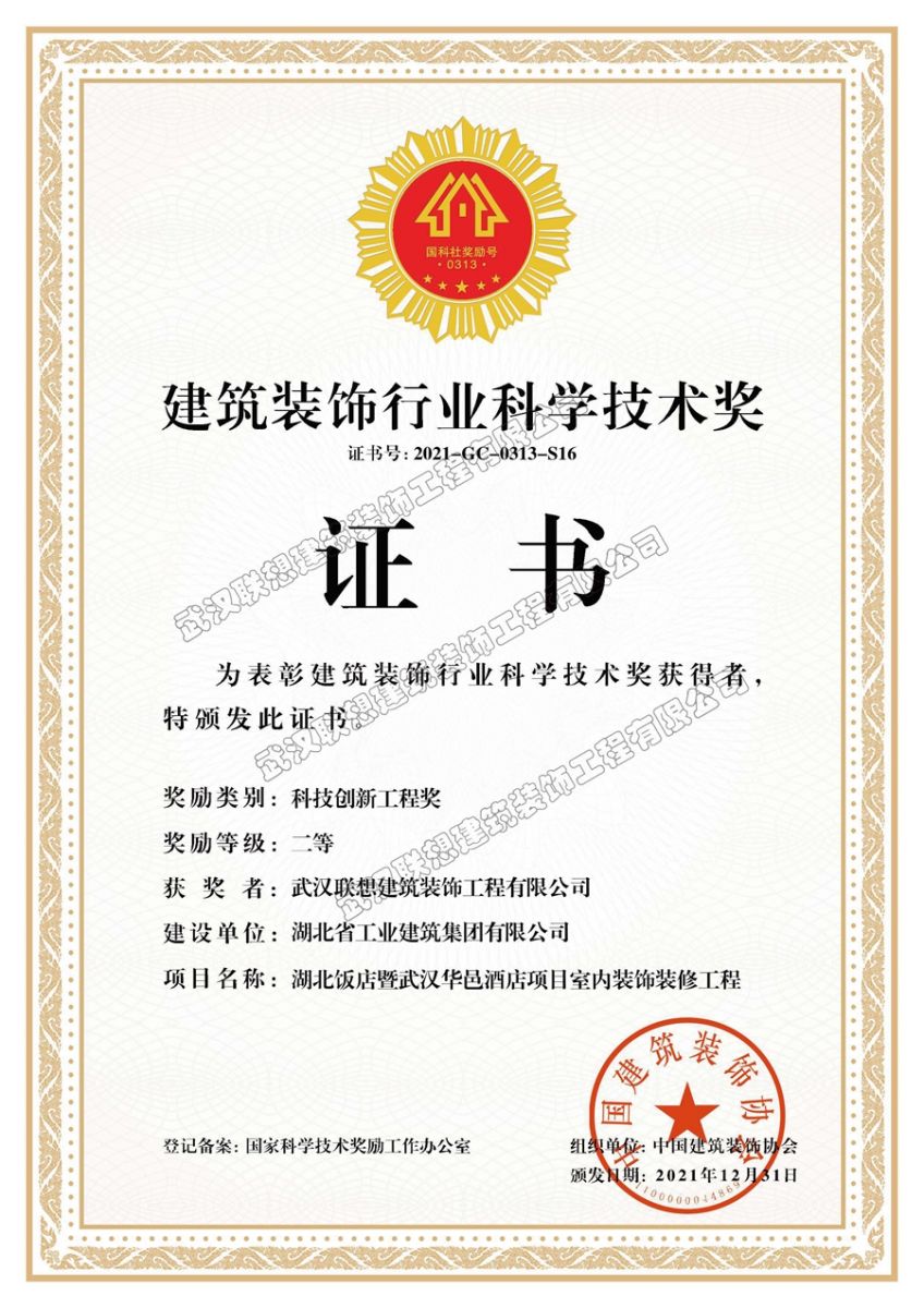 建筑裝飾行業(yè)科學技術獎(湖北飯店暨武漢華邑酒店項目室內(nèi)裝飾裝修工程)