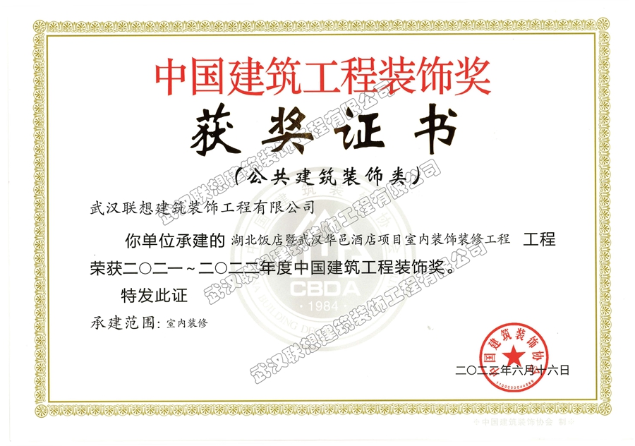 2021-2022年度中國建筑裝飾獎(湖北飯店暨武漢華邑酒店項目室內裝飾裝修工程)