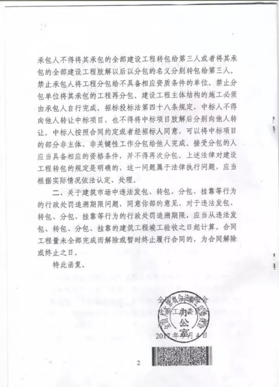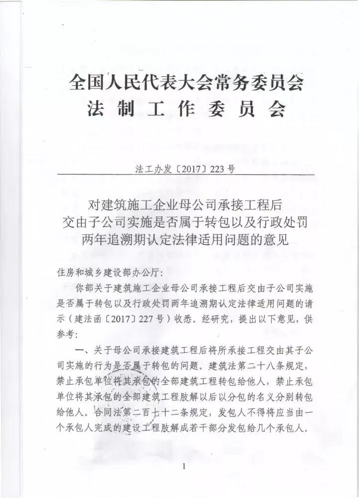 2017年,住建部曾向全國人大法工委發出請示函,全國人大法工委作出《對建筑施工企業母公司承接工程后交由子公司實施是否屬于轉包以及行政處罰兩年追溯期認定法律適用問題的意見》(法工辦發[2017]223號,以下簡稱《意見》)認為: