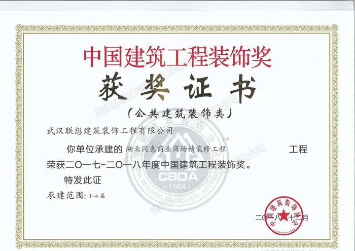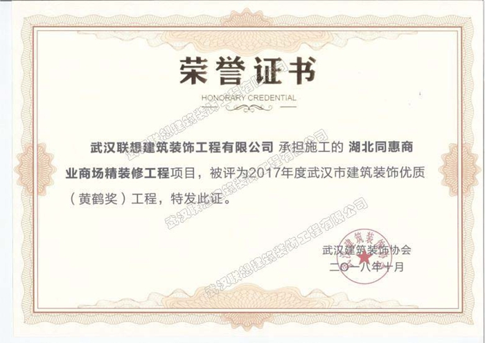 2017年度武漢市建筑裝飾優質工程黃鶴杯(湖北同惠商業商場精裝修工程)
