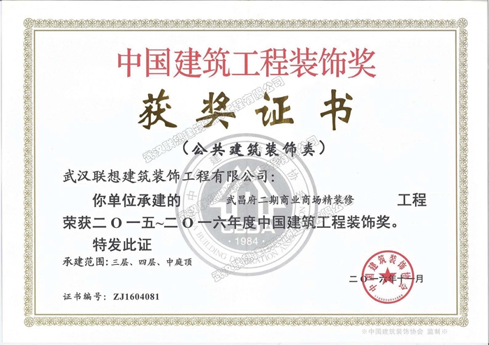 2015-2016年度中國建筑工程裝飾獎(武昌府二期商業商場精裝修工程)