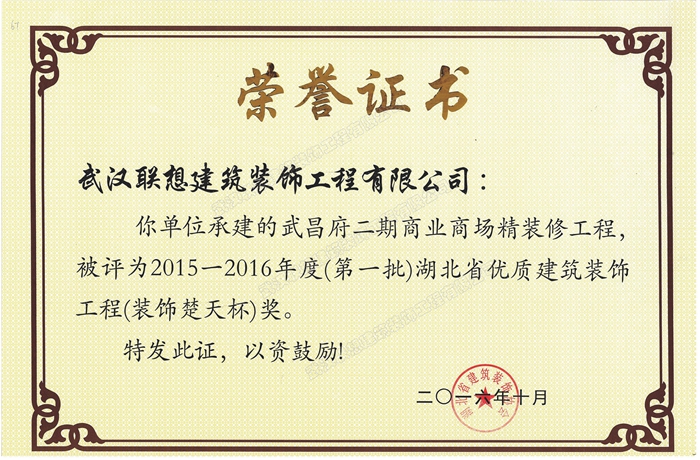 2015-2016年度湖北省優質建筑裝飾工程楚天杯(武昌府二期商業商場精裝修工程)