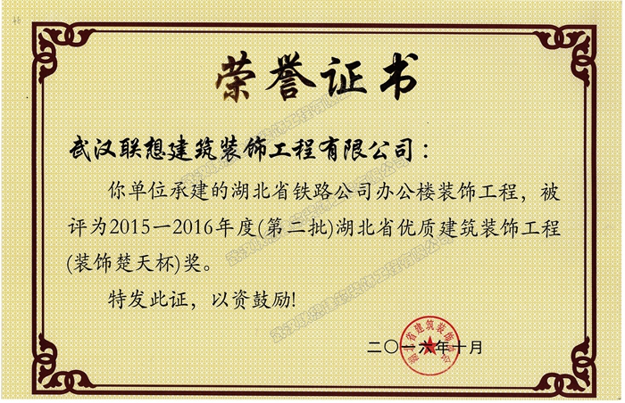 2015-2016年度湖北省優質建筑裝飾工程楚天杯(湖北省鐵路公司辦公樓裝飾工程)
