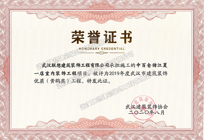 2019年度武漢市建筑裝飾優質工程黃鶴杯(中百倉儲江夏一店室內裝飾工程)