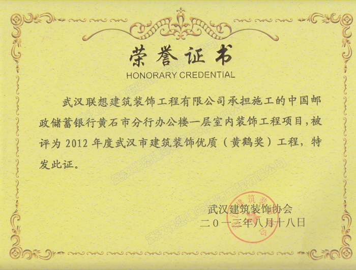 2012年度武漢建筑裝飾優質工程黃鶴杯(中國郵政儲蓄銀行黃石市分行室內裝飾工程)