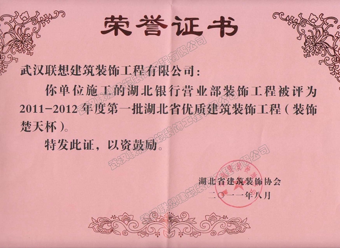 2011-2012年度湖北省優質建筑裝飾工程楚天杯(湖北銀行營業部裝飾工程)
