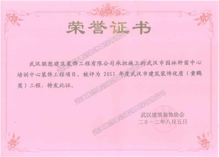 2011年度武漢建筑裝飾優質工程黃鶴杯(武漢市園林種苗中心培訓中心裝飾工程)