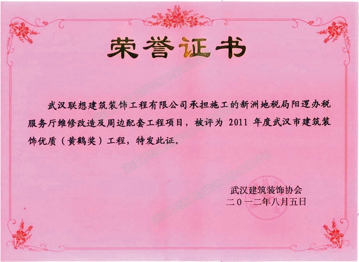 2011年度武漢建筑裝飾優質工程黃鶴杯(新洲地稅局陽邏辦稅服務廳維修改造及周邊配套工程)