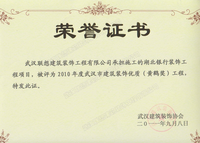 2010年度武漢建筑裝飾優質工程黃鶴杯(湖北銀行裝飾工程)