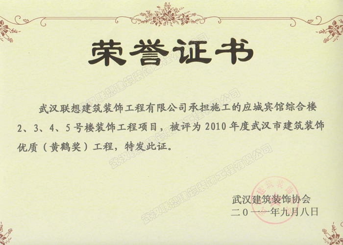 2010年度武漢建筑裝飾優質工程黃鶴杯(應城賓館綜合樓2、3、4、5號樓裝飾工程)