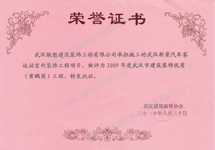 2009年度武漢建筑裝飾優質工程黃鶴杯(武漢新榮汽車客運站室內裝飾工程)
