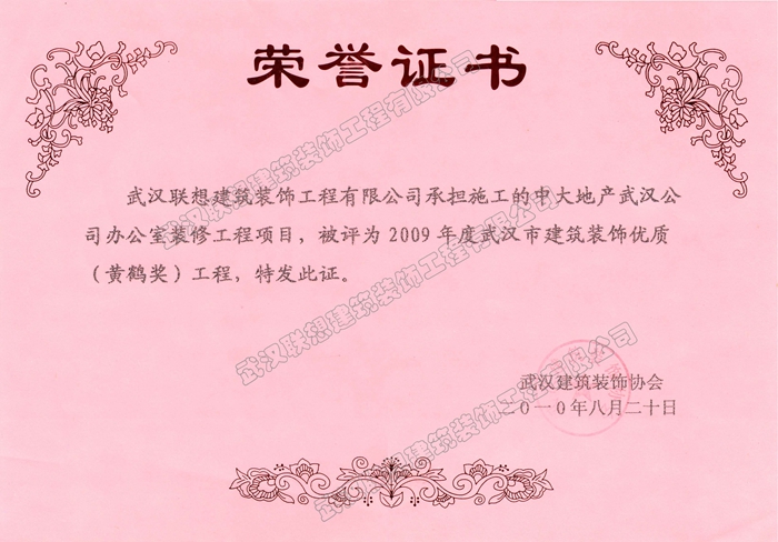 2009年度武漢建筑裝飾優質工程黃鶴杯(中大地產武漢公司辦公室裝修工程項目)